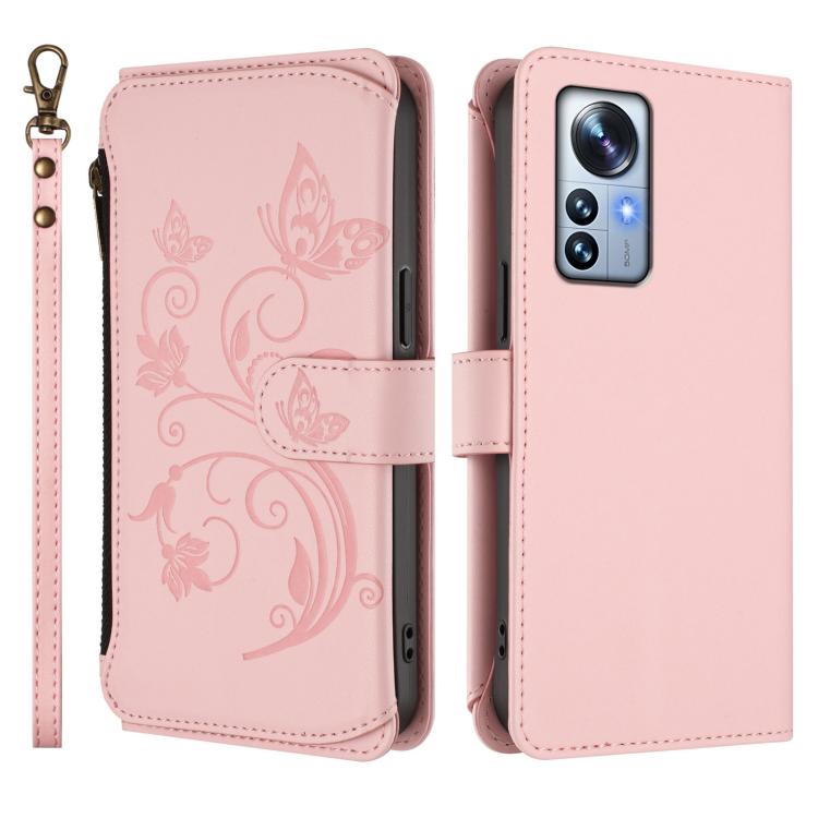 Funda de cuero con cremallera para Xiaomi 12 Pro / 12S Pro, diseño de mariposas, flores y múltiples tarjetas (rosa)