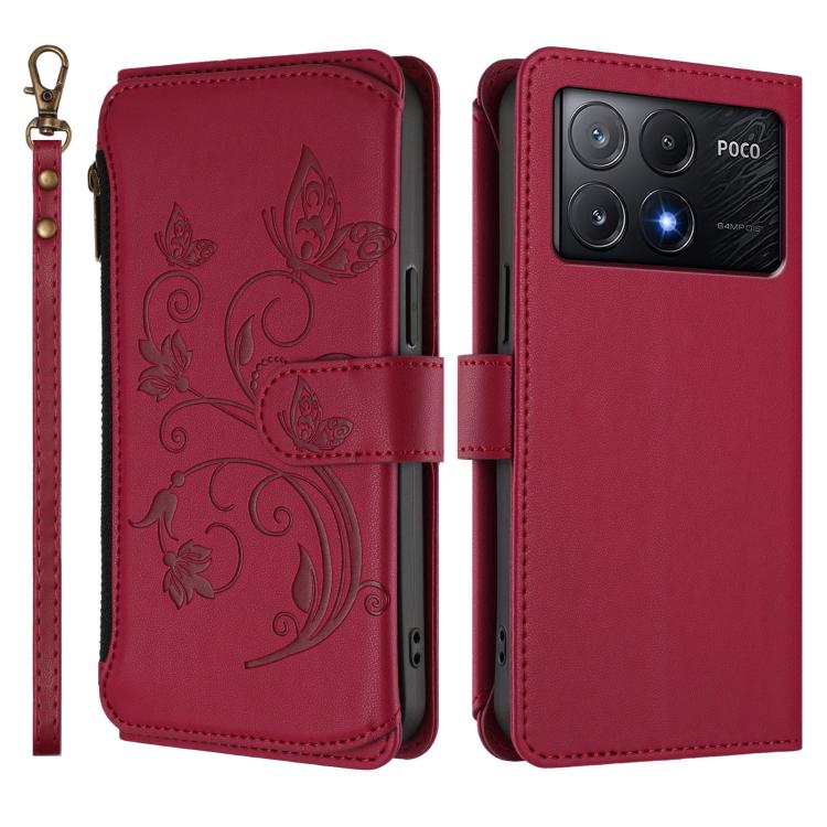 Funda de cuero con cremallera para Xiaomi Poco X6 Pro, diseño de mariposas, flores y mariposas (rojo vino)