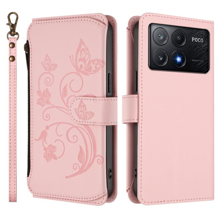 Funda de cuero con cremallera para Xiaomi Poco X6 Pro, diseño de mariposas, flores y mariposas (rosa)