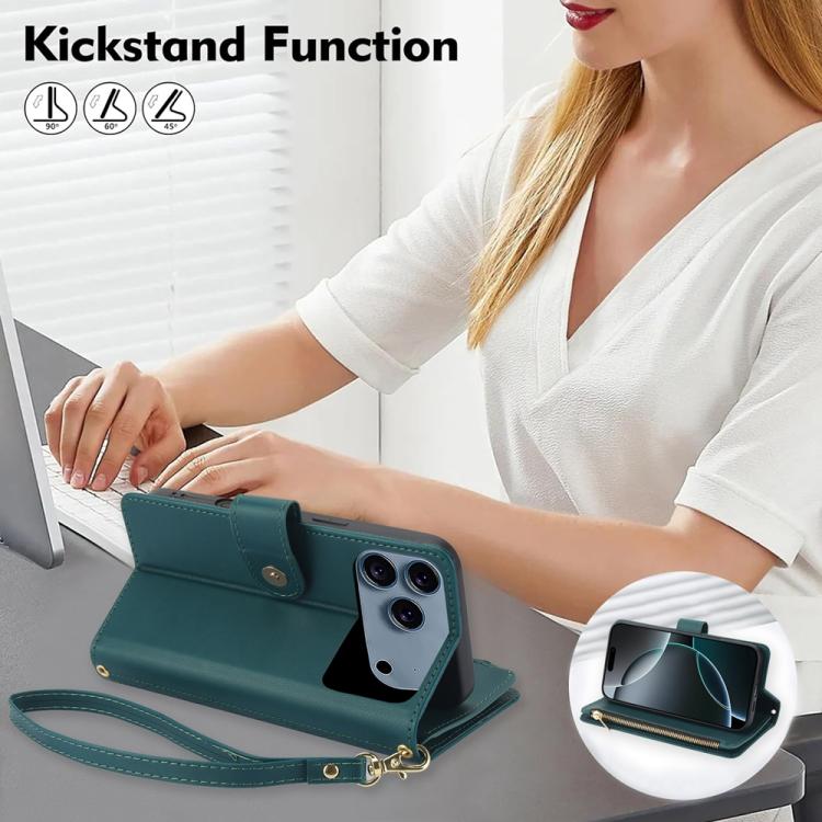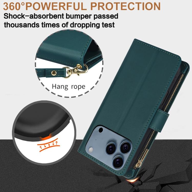 Funda de cuero con cremallera rombal para iPhone 17 Pro YM016 con tarjetero y cordón (verde)