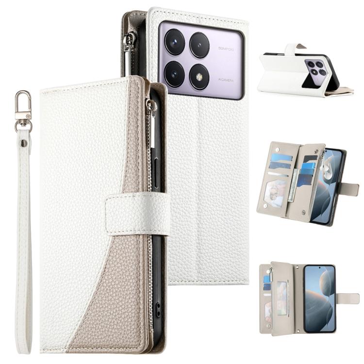 Funda de cuero con cremallera y múltiples tarjetas para Redmi K70 / K70 Pro / Poco F6 Pro, con costuras y correa corta (blanca)