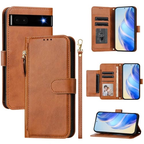 Funda de Cuero con Cremallera y Ranuras para Tarjetas para Google Pixel 6A (Marrón)