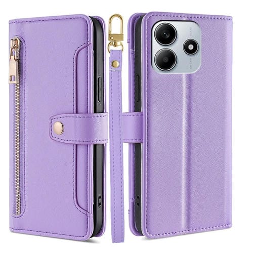 Funda de Cuero Tipo Cartera con Cremallera y Textura de Oveja para Redmi Note 14 5G (Morado)