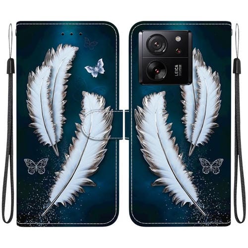 Funda de Cuero con Dibujo de Colores y Textura de Cristal para Xiaomi 13T/13T Pro (Plumas de Mariposa Blancas)