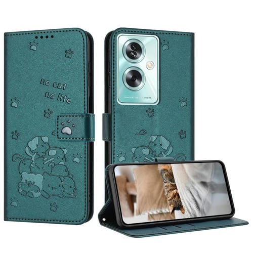 Funda de Piel con Diseño de Gatito En Relieve para Oppo A79 5G con Cordón (Verde Oscuro)