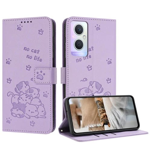 Funda de Cuero con Diseño de Gatito En Relieve para Oppo Reno7 Z Global con Cordón (Morado)