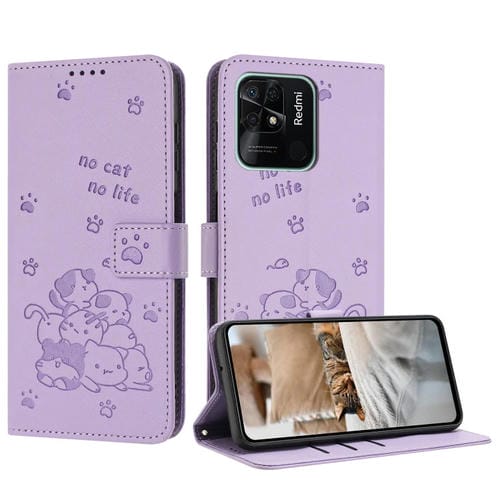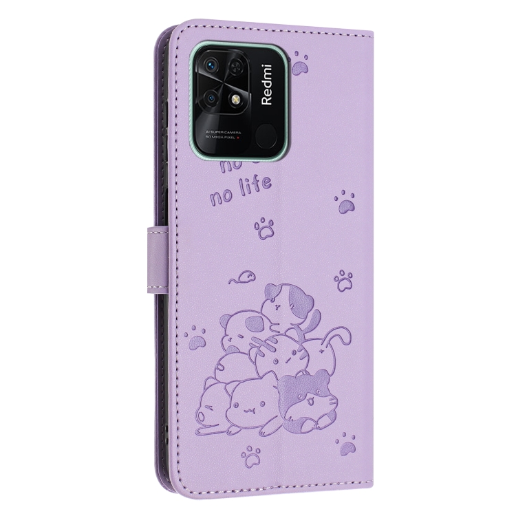 Funda de Cuero con Diseño de Gatito En Relieve para Redmi 10C 4G Global con Cordón (Morado)