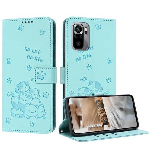 Funda de Cuero con Estampado de Gatito En Relieve para Redmi Note 10 4G (Verde Menta)