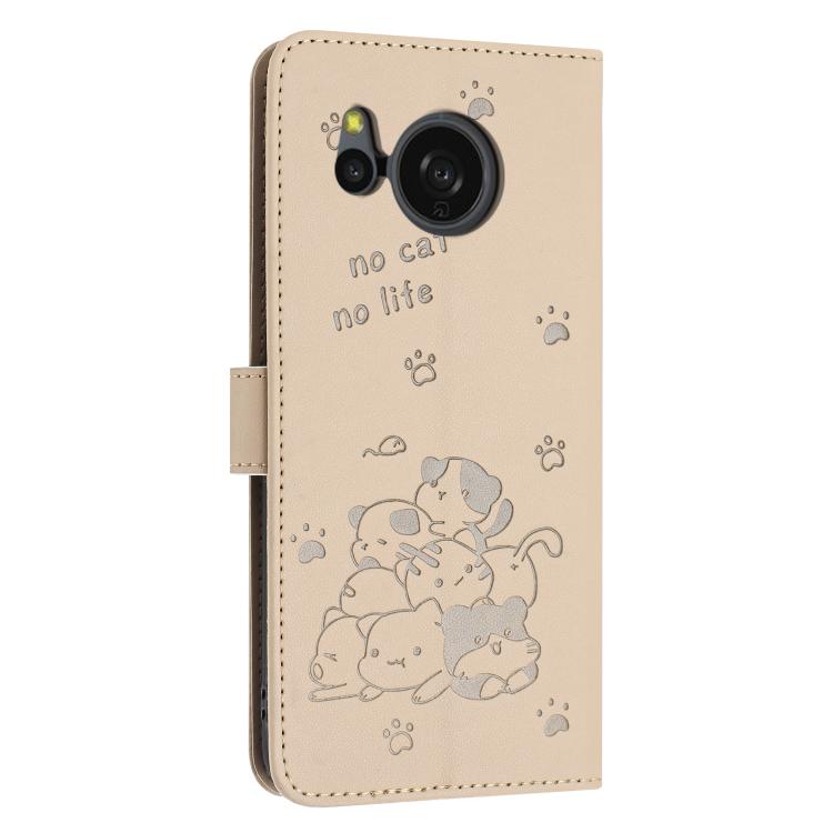 Funda de Cuero para Sharp Aquos Sense 8 con Diseño de Gatito en Relieve y Cordón (Beige)