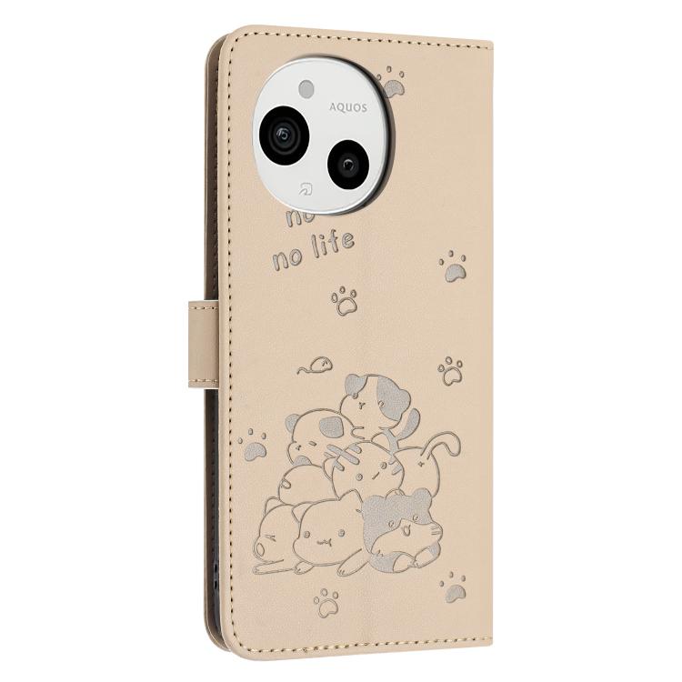Funda de Cuero para Sharp Aquos Sense 9 con Diseño de Gatito En Relieve y Cordón (Beige)
