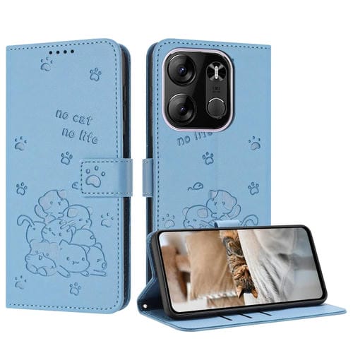 Funda de Cuero para Tecno Spark Go 2023 con Diseño de Gatito en Relieve y Cordón (Azul)