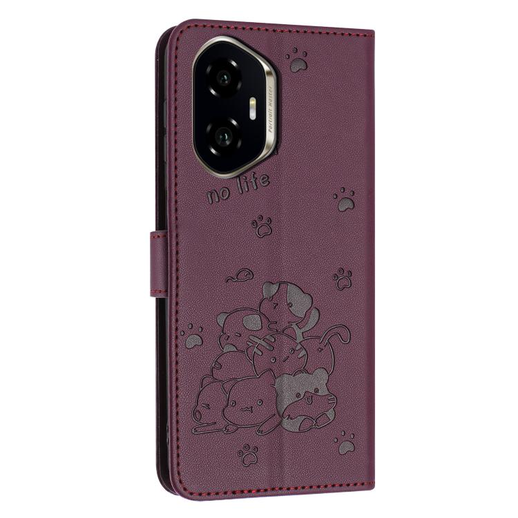 Funda de Piel para Honor 300 con Diseño de Gatito en Relieve y Cordón (Rojo Vino)