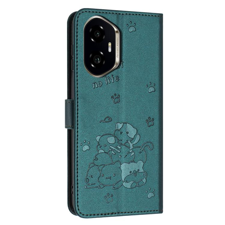 Funda de Cuero para Honor 300 con Diseño de Gatito en Relieve y Cordón (Verde Oscuro)