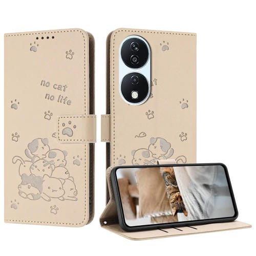 Funda de Piel para Honor X7B 4G/5G con Diseño de Gatito en Relieve y Cordón (Beige)