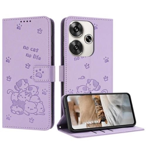 Funda de Piel con Diseño de Gatito En Relieve y Cordón para Xiaomi Poco F6 (Morado)