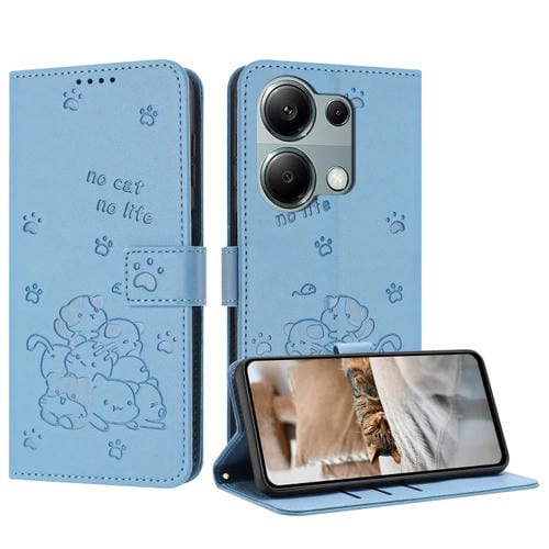 Funda de Piel con Diseño de Gatito En Relieve y Cordón para Xiaomi Poco M6 Pro 4G (Azul)
