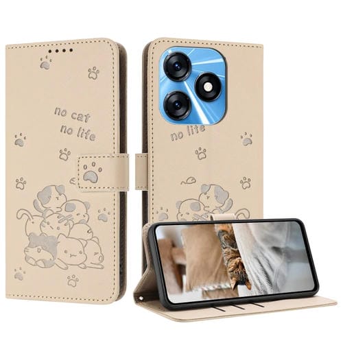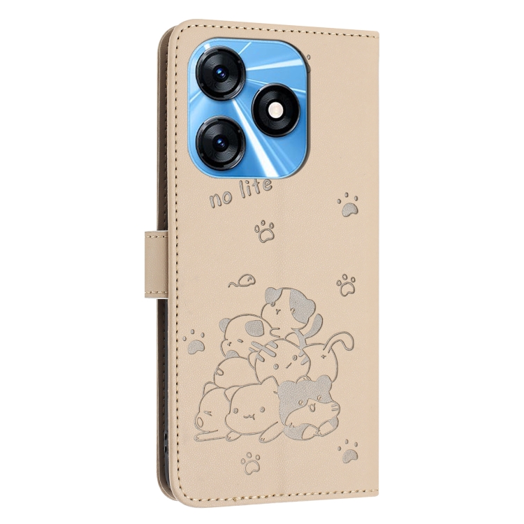 Funda de Cuero para Tecno Spark 10 4G y Spark 10C con Diseño de Gatito En Relieve y Cordón (Beige)
