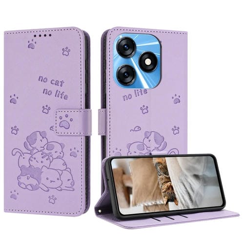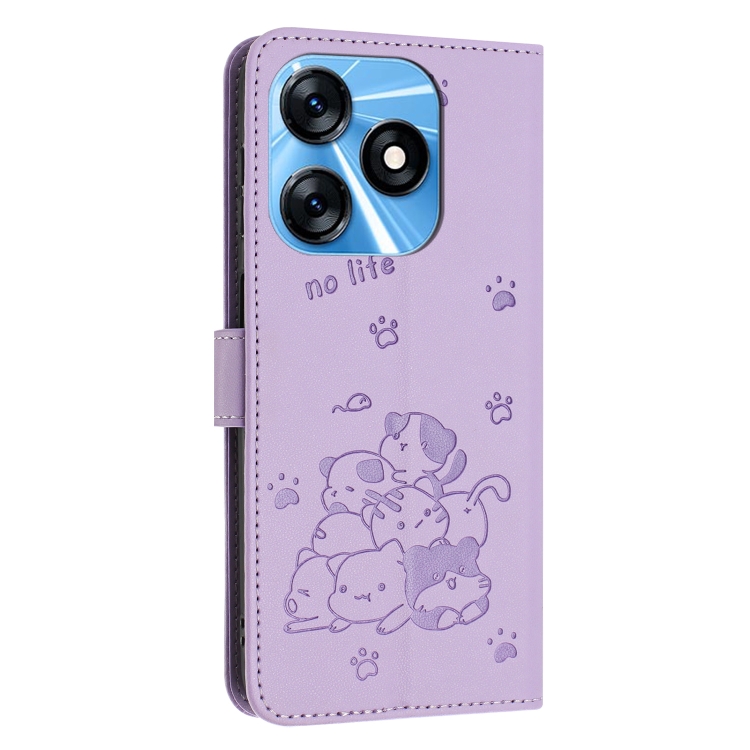 Funda de Cuero para Tecno Spark 10 4G y Spark 10C con Diseño de Gatito En Relieve y Cordón (Morado)