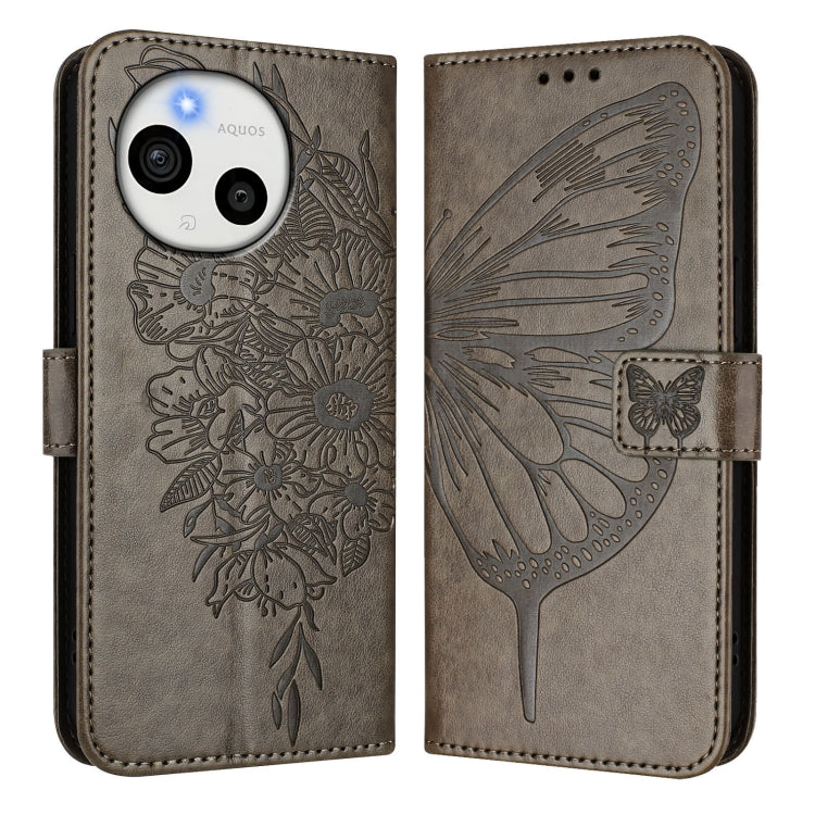 Funda de Cuero para Sharp Aquos Sense9 Plus con Diseño de Mariposa En Relieve (Gris)