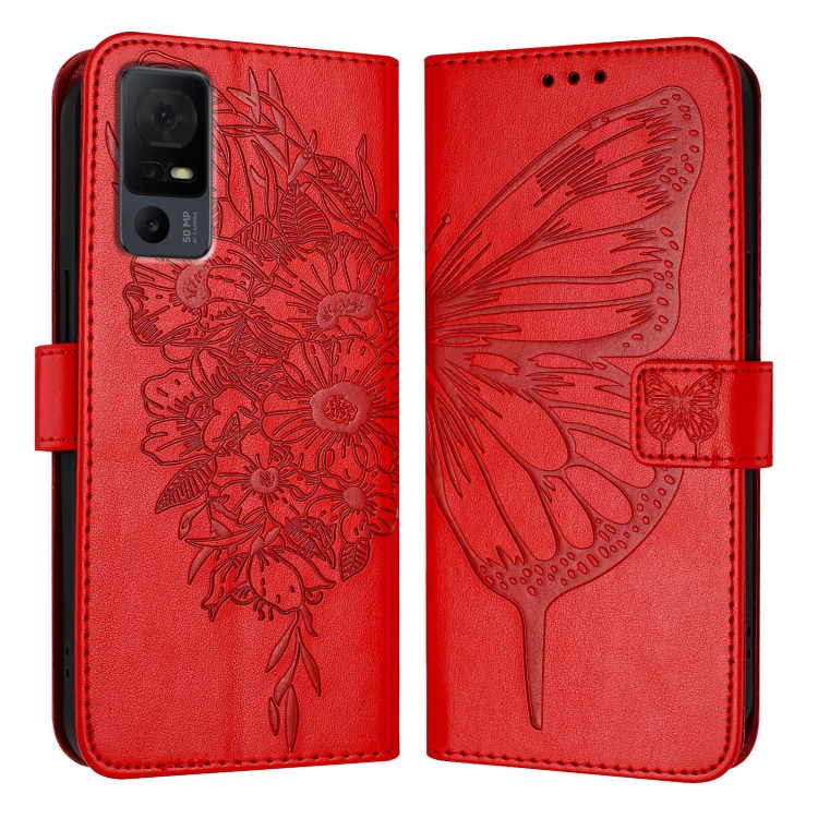 Funda de Cuero para TCL 40 XL/40 T T608DL con Diseño de Mariposa en Relieve (Rojo)