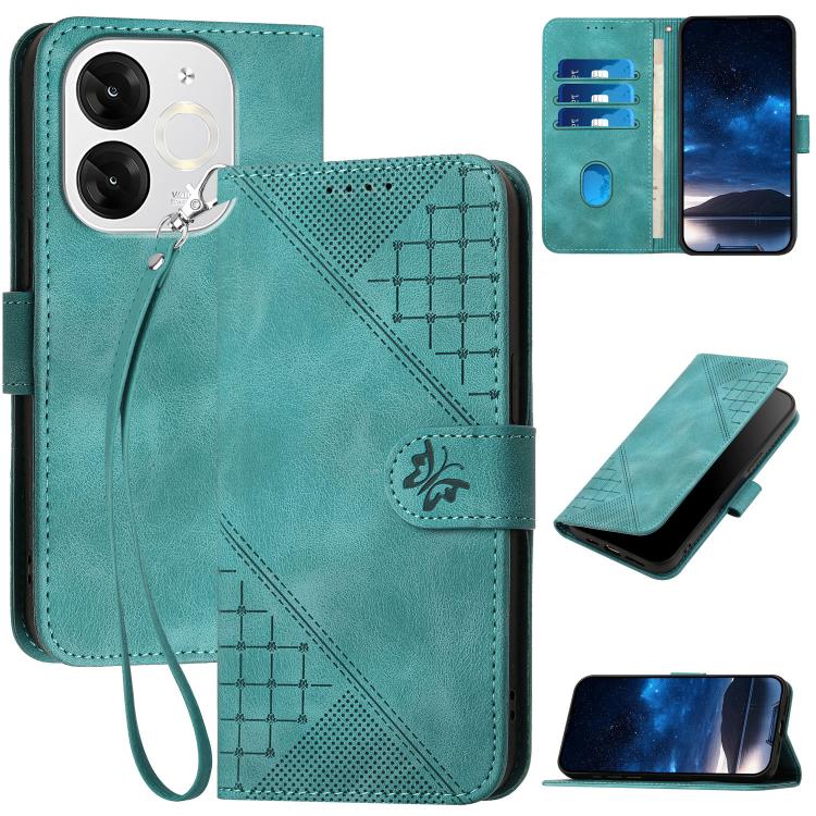 Funda de Cuero Itel A80 con Diseño de Mariposa En Relieve y Cuadrícula con Cordón (Azul Claro)