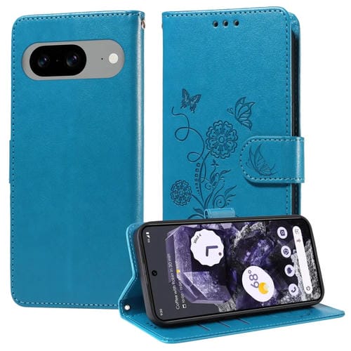 Funda de Cuero para Google Pixel 8 con Diseño de Mariposas y Flores en Relieve (Azul)