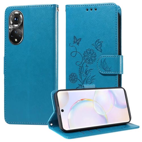 Funda de Cuero con Diseño de Mariposas y Flores en Relieve para Honor 50 5G Huawei Nova 9 (Azul)