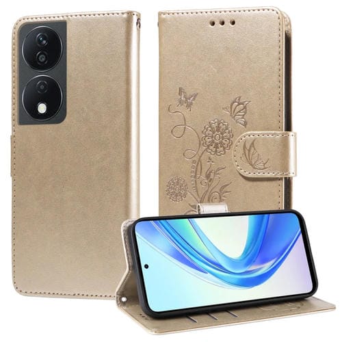 Funda de Cuero para Honor Play 50 Plus y Play 8T con Diseño de Mariposas y Flores en Relieve (Dorada)