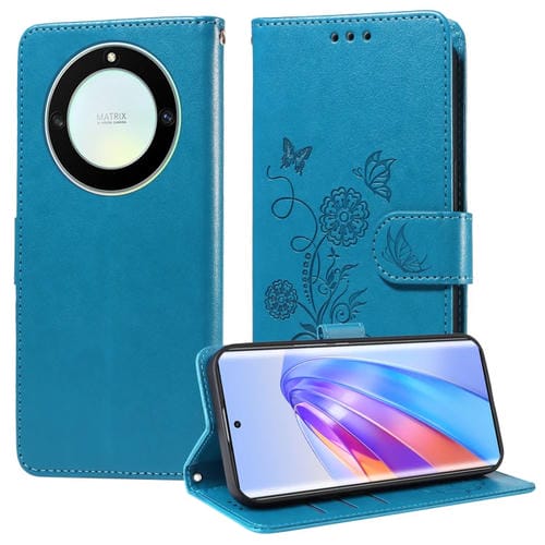 Funda de Cuero con Diseño de Mariposas y Flores en Relieve para Honor X9A 5G / Magic5 Lite / X40 5G (Azul)
