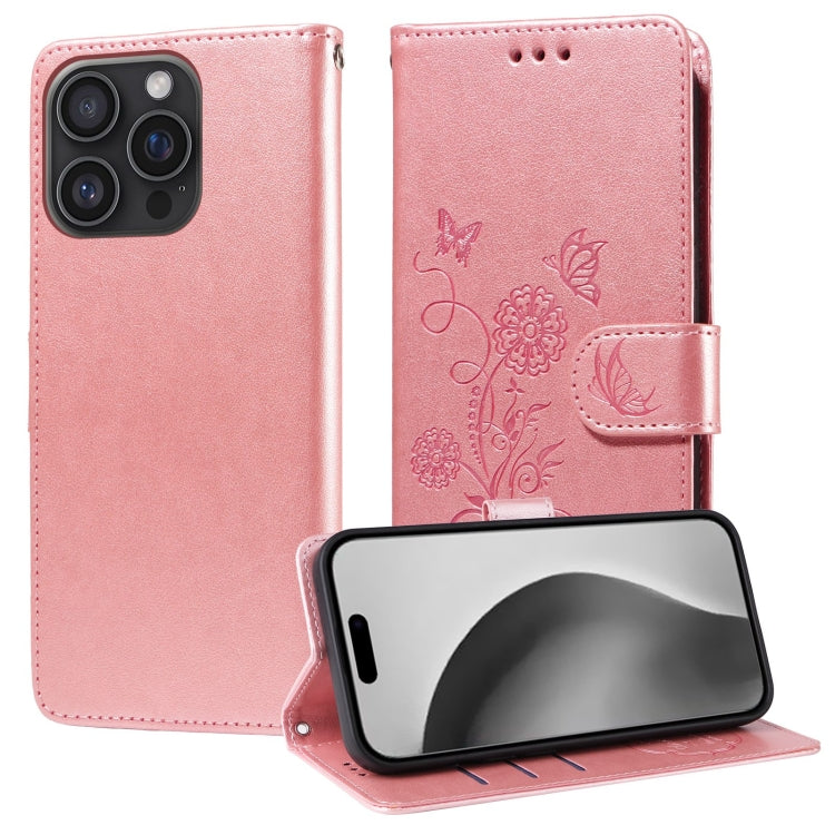 Funda de Cuero iPhone 16 Pro Diseño Mariposas y Flores En Relieve (Oro Rosa)