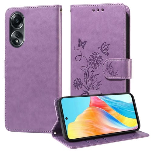 Funda de Cuero con Diseño de Mariposas y Flores En Relieve para Oppo A58 4G (Morado)
