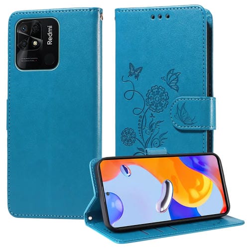 Funda de Cuero con Diseño de Mariposas y Flores En Relieve para Redmi 10C/10 India/10 Power (Azul)