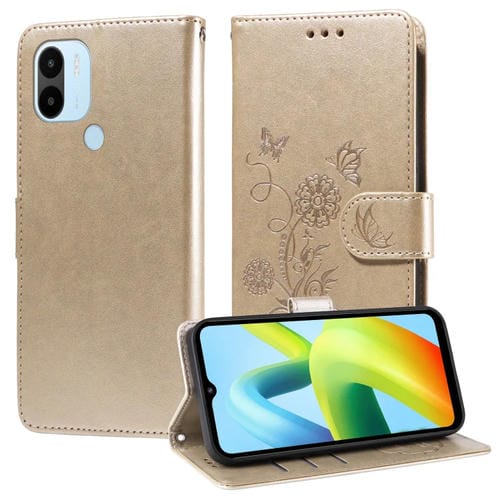 Funda de Cuero con Diseño de Mariposas y Flores En Relieve para Xiaomi Poco C50/C51 (Dorada)