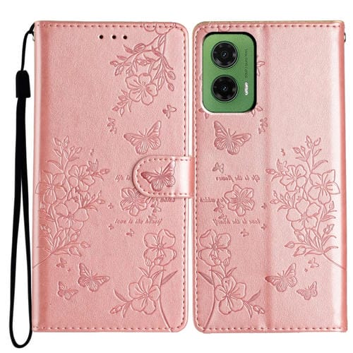 Funda de Cuero con Mariposas y Flores para Motorola Moto G35 (Oro Rosa)