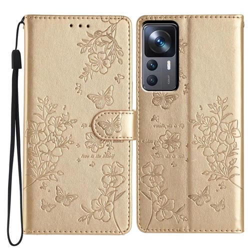 Funda de Cuero con Diseño de Mariposas y Flores para Xiaomi 12T/12T Pro (Dorada)