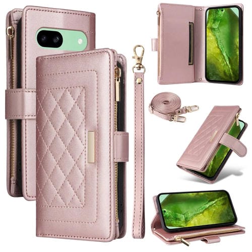Funda de Cuero con Diseño de Rombos y Billetera Cruzada con Cremallera para Google Pixel 8A (Oro Rosa)