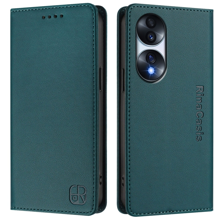 Funda de Cuero Rfid para Honor 70 Rc01 con Doble Pliegue y Succión Magnética (Verde Oscuro)
