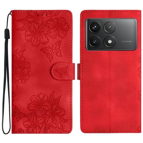 Funda de Cuero con Estampado de Flores y Mariposas para Xiaomi Poco F6 Pro (Rojo)