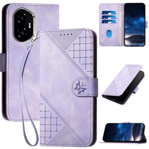 Funda de Cuero para Honor 300 con Estampado de Mariposas en Relieve y Cordón (Morado Claro)