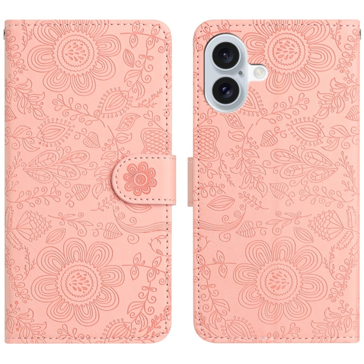 Funda de Cuero para iPhone 16 Estampado Floral en Relieve (Rosa)