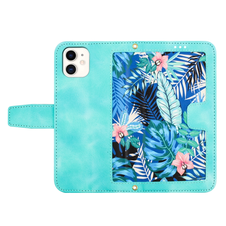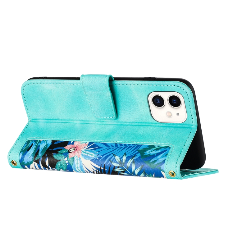 Funda de Cuero iPhone 11 Estampado Floral con Cordón (Verde)