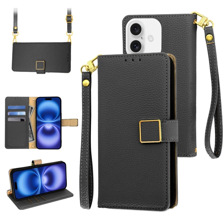 Funda de Cuero para iPhone 16 con Hebilla Cuadrada y Textura de Lichi (Negra)