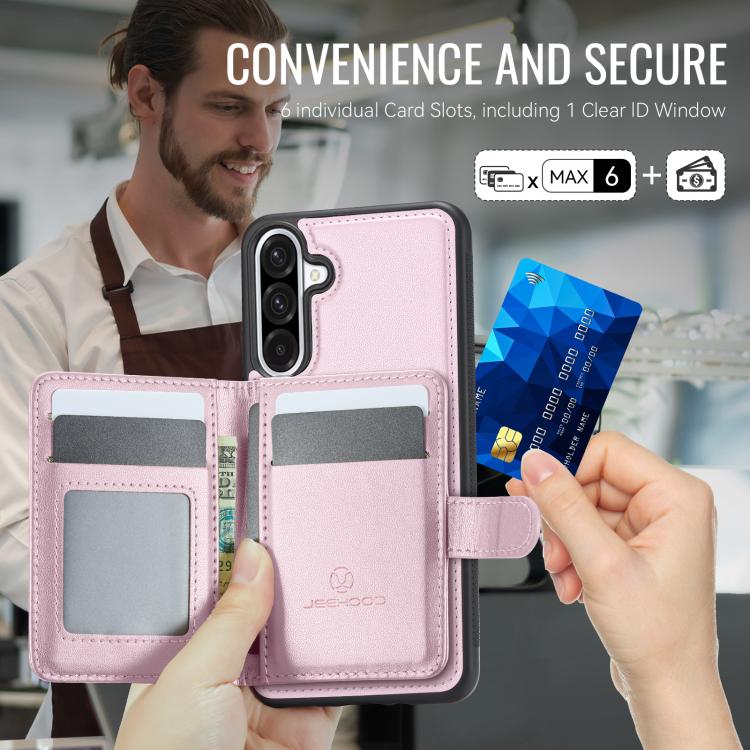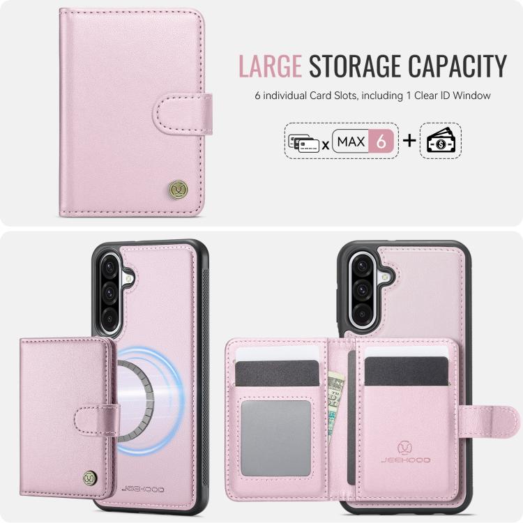 Funda de cuero con hebilla magnética para Samsung Galaxy A56 5G JEEHOOD J09, con ranuras para tarjetas, estilo RFID y MagSafe (rosa)