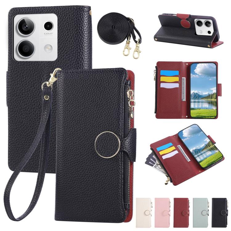 Funda de cuero con hebilla redonda y cremallera para Redmi Note 13 5G, con correa cruzada (negro)