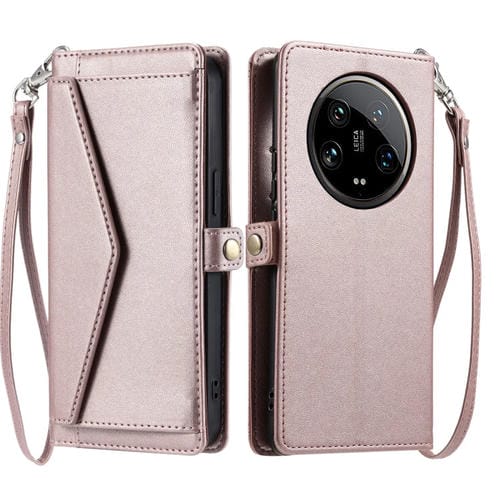 Funda De Cuero Con Ranura Para Múltiples Tarjetas Y Cordón Para Xiaomi 14 Ultra 5G (Oro Rosa)