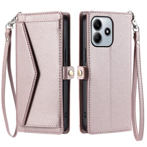 Funda de Cuero con Ranura para Múltiples Tarjetas y Cordón para Xiaomi Redmi Note 14 5G (Oro Rosa)