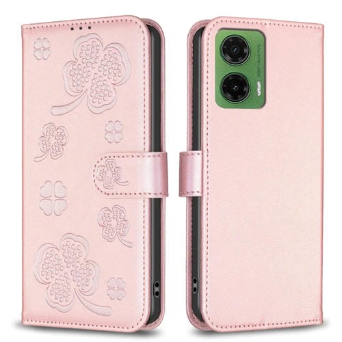 Funda Cuero con Relieve Cuatro Hojas para Motorola Moto G35 (Rosa)