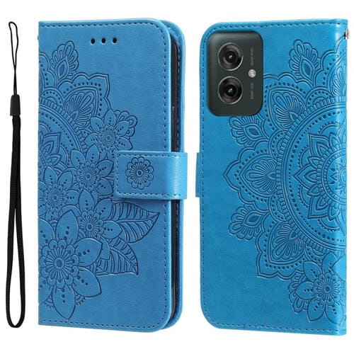 Funda de Cuero con Relieve de Flores de Siete Pétalos para Motorola Moto G55 (Azul)