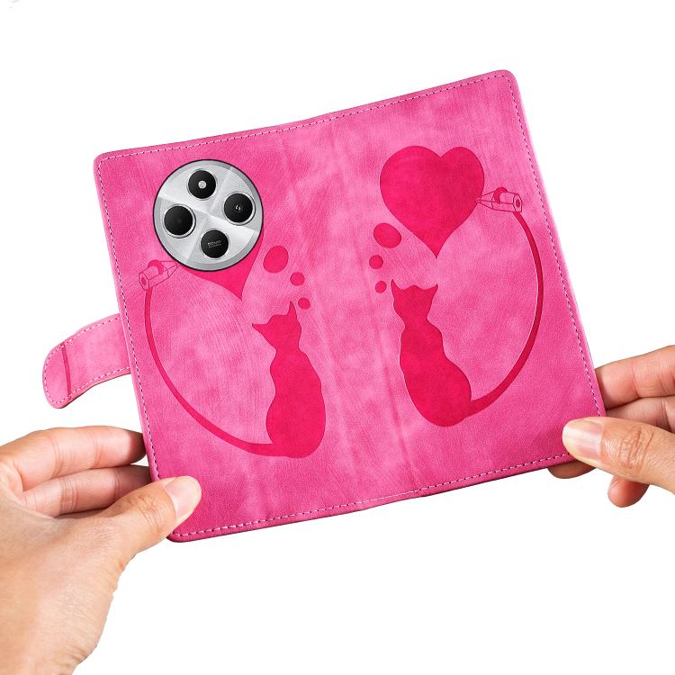 Funda de Cuero con Relieve de Gato y Corazón para Xiaomi Poco C75 (Rosa)