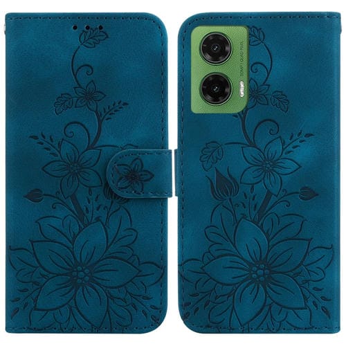 Funda de Cuero con Relieve de Lirios para Motorola Moto G35 (Azul Oscuro)